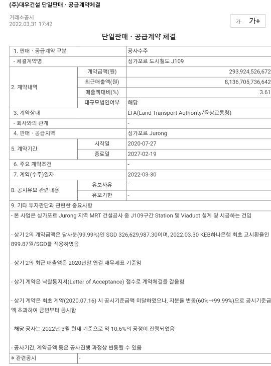 동사는 도로, 철도 등 사회기반시설을 건설하는 토목사업과 아파트등을 건설하는 주택건축사업, 석유화학시설 및 발전소를 건설하는 플랜트사업을 영위. 세계 최대수심, 최장 및 국내 최초 침매터널 공사인 거가대로, 국내 최장 도로터널인 인제터널을 성공리에 관통시키는 등 첨단 기술력을 입증하며 시장선도. 고부가가치 창출이나 안정적인 수익 발생이 가능한 공종을 추가로 발굴하고, 사업 다각화를 통해 다양한 미래 먹거리를 확보 노력중.