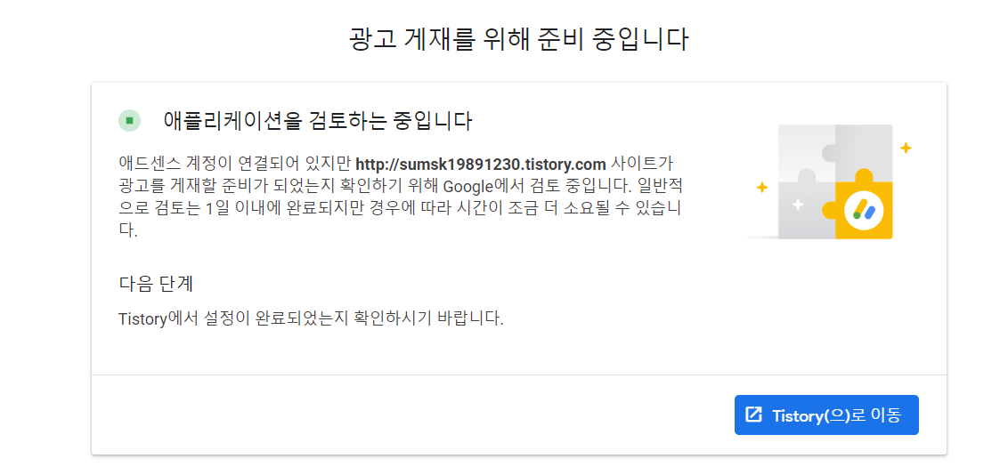 그냥 바로 애드센스 연동을 다시 한번 클릭해줬더니 바로 아래와 같이 수익 승인창이 뜸