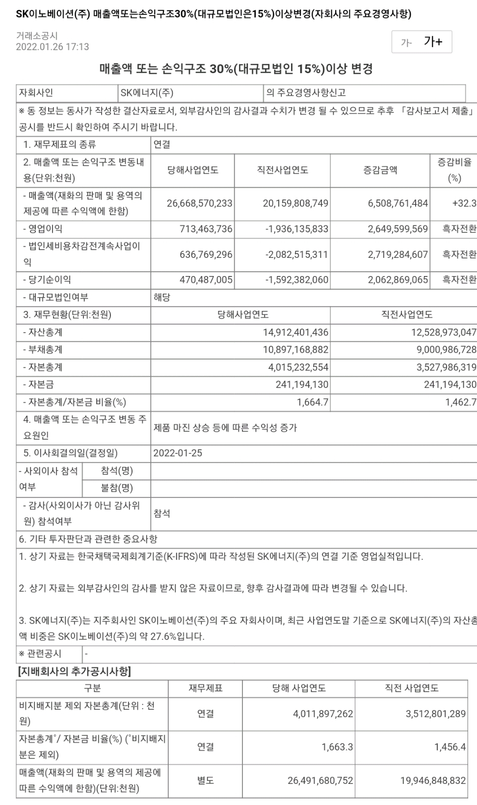 SK에너지, 작년 영업익 7135억…SK이노 4년만에 2兆 돌파 [출처 : 뉴스웨이 2022.01.26]