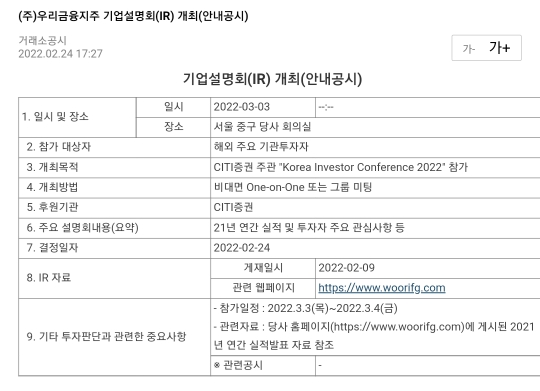 동사는 2019년 1월 설립한 지주회사로 금융업을 영위하거나 밀접한 관련이 있는 종속기업을 지배하는 것이 주 사업목적임. 주요 종속회사들의 사업은 은행업(우리은행), 신용카드업(우리카드), 종합금융업(우리종합금융) 등이 있으며, 2019년 우리자산운용/ABL자산운용(우리글로벌)을 편입하면서 자산운용업 추가하였음. 20년 12월 아주캐피탈 지분 74.04%를 5,724억원에 취득하여 자회사로 우리금융캐피탈과 우리금융저축은행 편입.