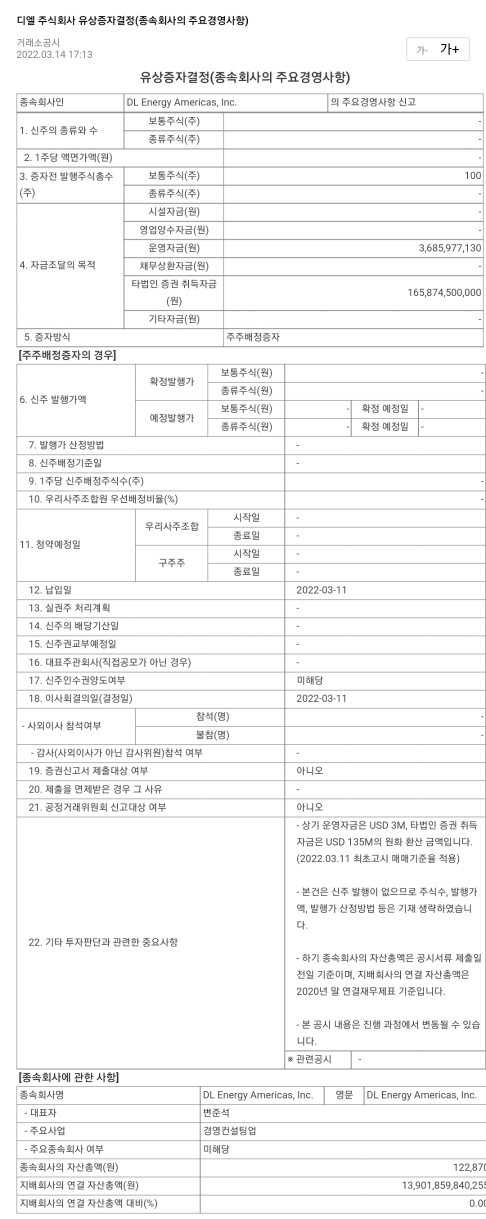 전병욱 대표이사는 “DL에너지는 국내뿐만 아니라 세계 시장에서 인정받는 민자발전 디벨로퍼로 자리매김했다”며 “앞으로 미국 민자 발전시장에서 수익성과 안정성이 기대되는 좋은 자산을 선별해 투자를 이어나갈 예정”이라고 밝혔다.