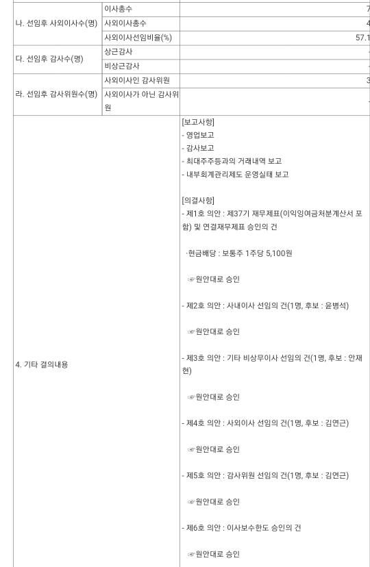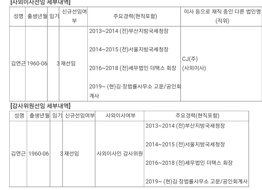 사외이사에는 서울지방국세청장을 역임한 김연근 김앤장법률사무소 고문을 재선임했다.