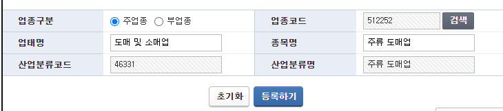 저는 주류업 등록이 필요해서 업종코드 검색 후 아래 정보로 등록 예정입니다.