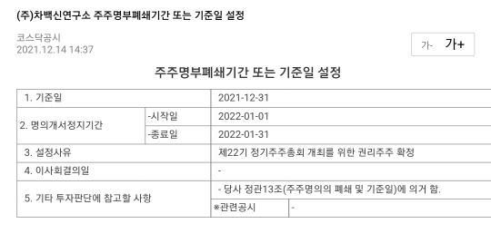 차백신연구소 보유 주식 기업 재무 분석 배당 전망 공시